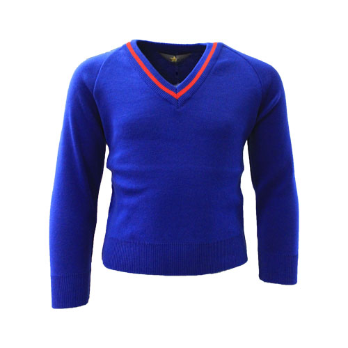 - V- Neck jumper in royal blue with red contrast stripes